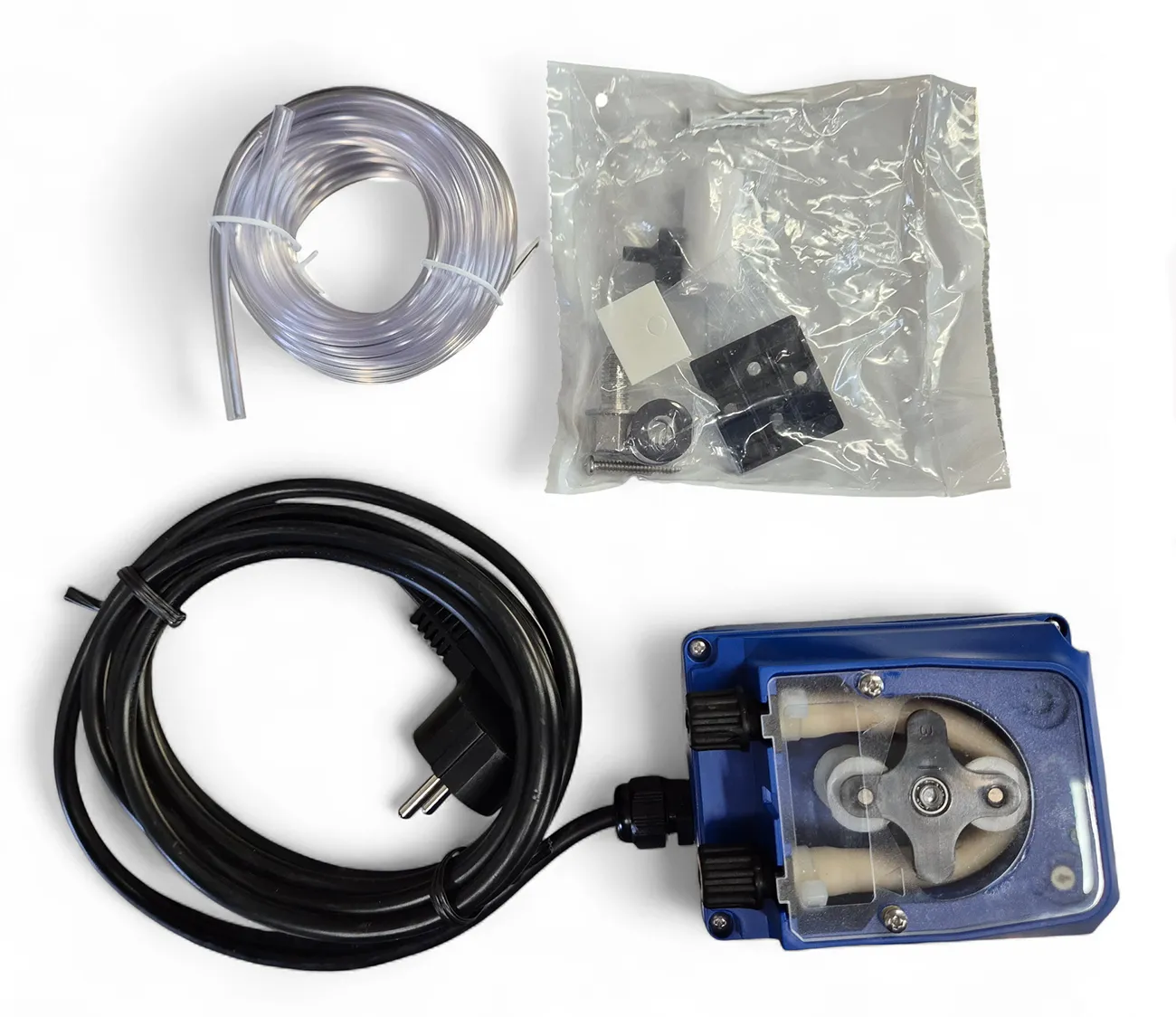 Pakkauksessa tulee mukana letku, letkun päähän keraamipaino sekä karkeasuodatin (imevään letkuun), 90 asteen läpivienti sekä kiinnike seinäkiinnitystä varten.