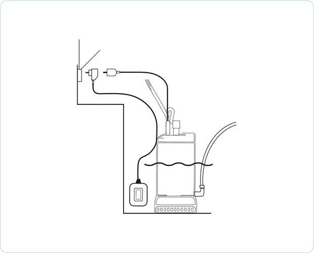 Laitetaan Piggy Plug pistorasiaan, kytketään pinta-anturi Piggy Plugiin sekä lopuksi laitetaan pumpun pistotulppa Piggy Plugin toiseen päähän. Näin saadaan toteutettua yksinkertainen uppopumpun ohjaus erillisellä pintakytkimellä. Katso esimerkkikuva!