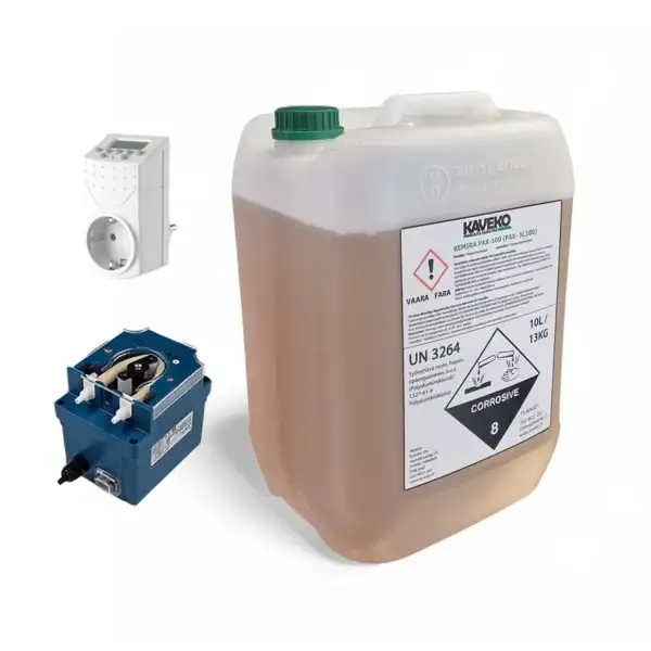 Valmis kokonaisuus saostuskemikaalin helppoon ja hallittuun annosteluun. Paketti sisältää kaiken tarvittavan: annostelupumpun, ajastimen sekä saostuskemikaalin. Helppo ja nopea käyttöönotto.